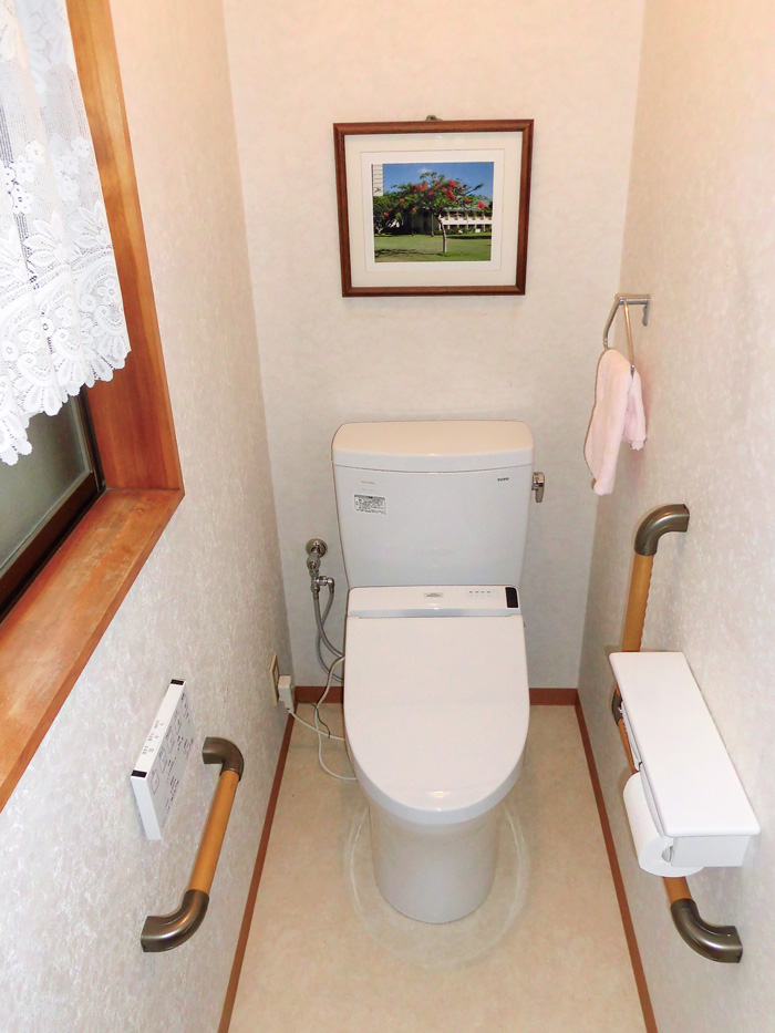 <リフォーム> トイレ:TOTO ピュアレストQR手洗い無し ペーパーホルダー(2連):TOTO YH64SR パイプファン取替:Panasonic FY-08PD9 <新設> トイレ:TOTO ネオレスト 手洗いセレクトS 建具:片開き 巾木・廻り縁:NODA BINOIE クロス・クッションフロア:サンゲツ製品 |